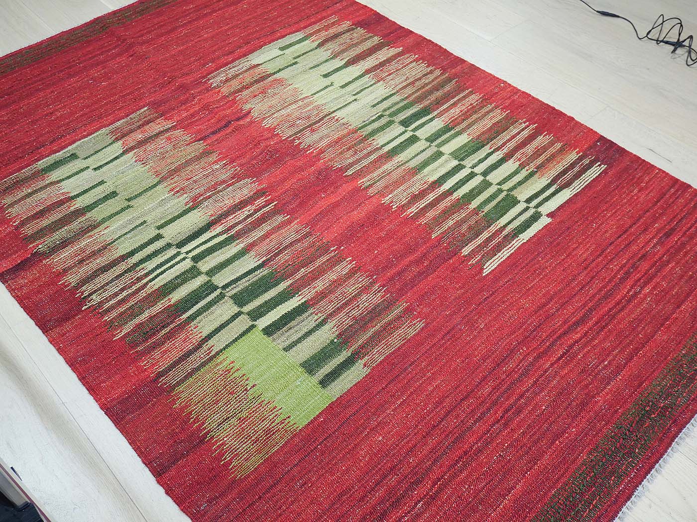 Ce tapis kilim fait main est tissé à plat selon une technique de tissage de tapisserie. Il est fabriqué exclusivement pour Nomade Kilim avec beaucoup de soin et d'attention aux détails. Nos nouveaux kilims s'inspirent des kilims anciens de Mazandaran tissés dans le nord de l'Iran, qui étaient pratiquement inconnus du commerce des tapis jusqu'à récemment et qui sont appréciés pour leurs motifs primitifs uniques et leurs combinaisons de couleurs minimalistes d'une grande beauté.