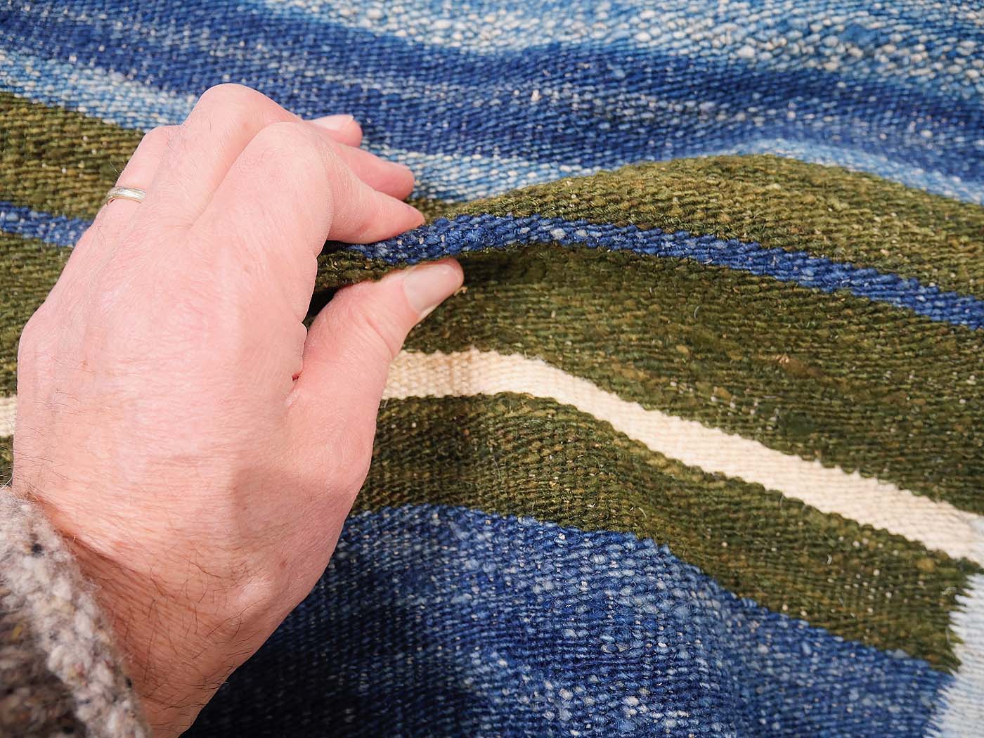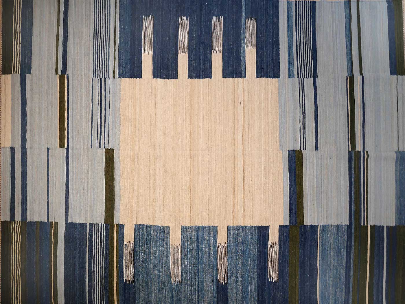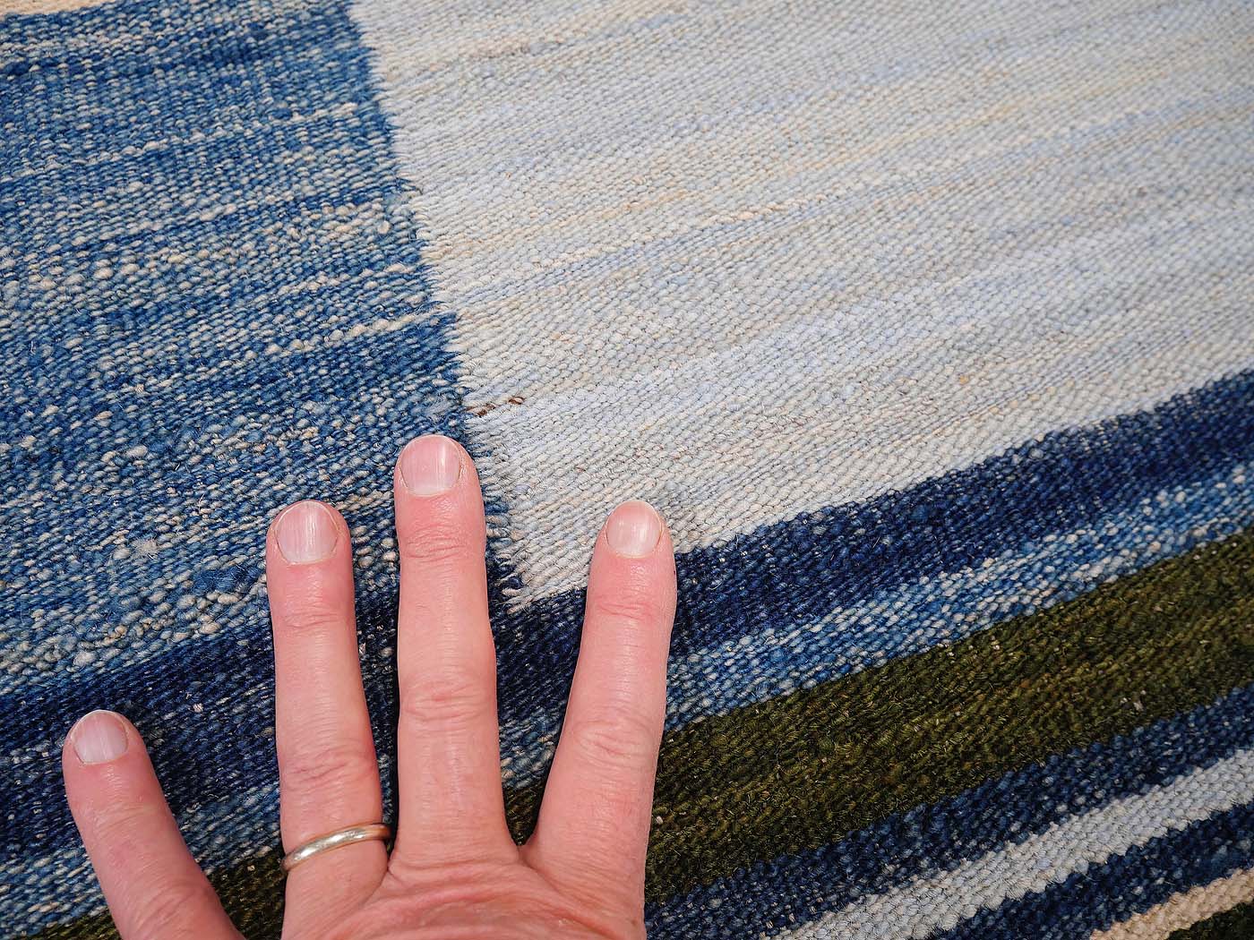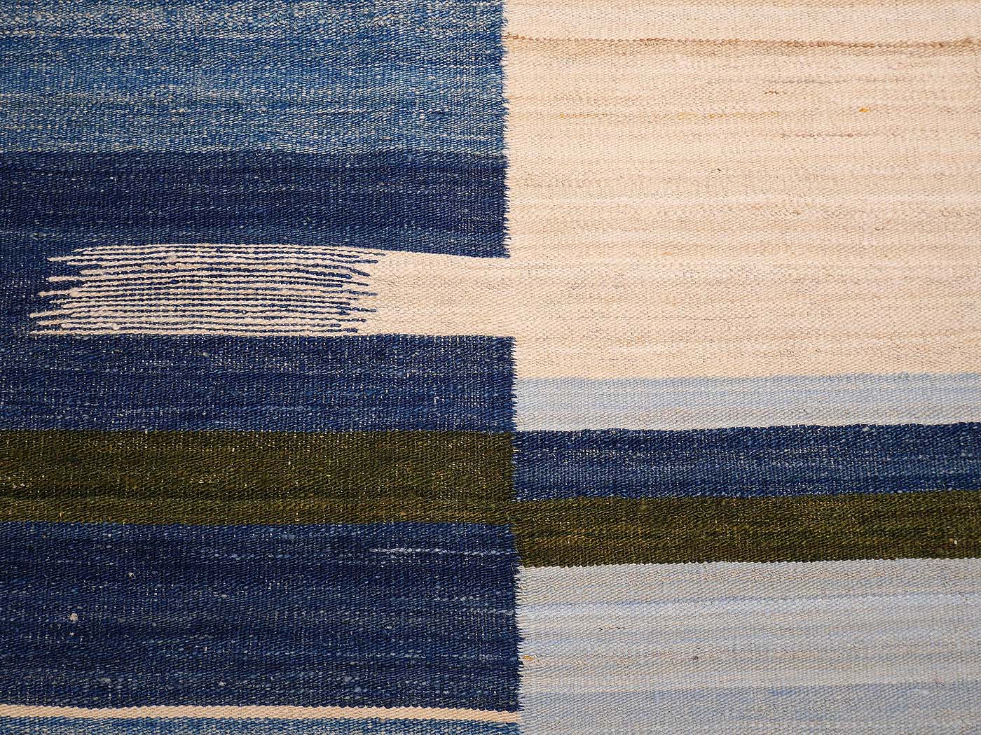 Ce tapis kilim fait main est tissé à plat selon une technique de tissage de tapisserie. Il est fabriqué exclusivement pour Nomade Kilim avec beaucoup de soin et d'attention aux détails.  Nos nouveaux kilims s'inspirent des kilims anciens de Mazandaran tissés dans le nord de l'Iran, qui étaient pratiquement inconnus du commerce des tapis jusqu'à récemment et qui sont appréciés pour leurs motifs primitifs uniques et leurs combinaisons de couleurs minimalistes d'une grande beauté.