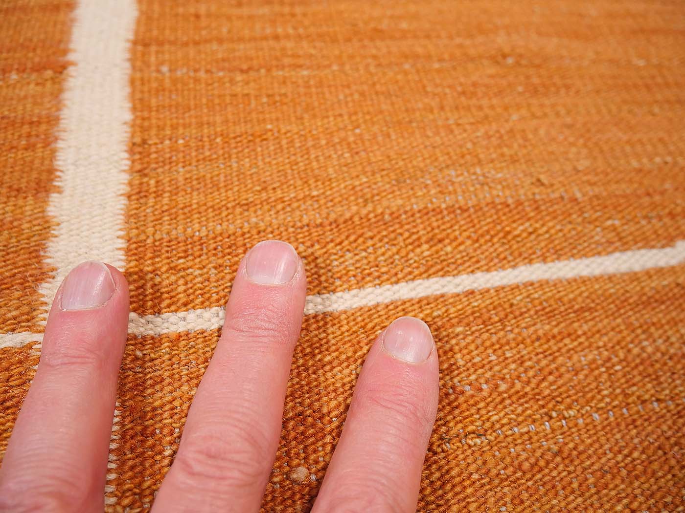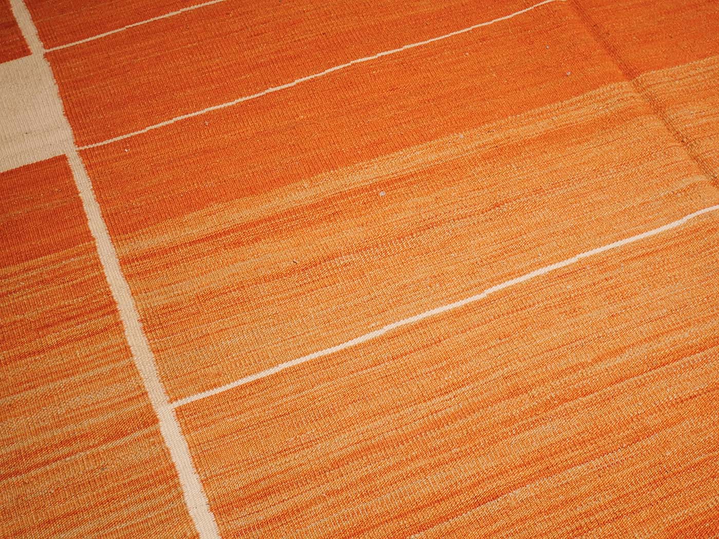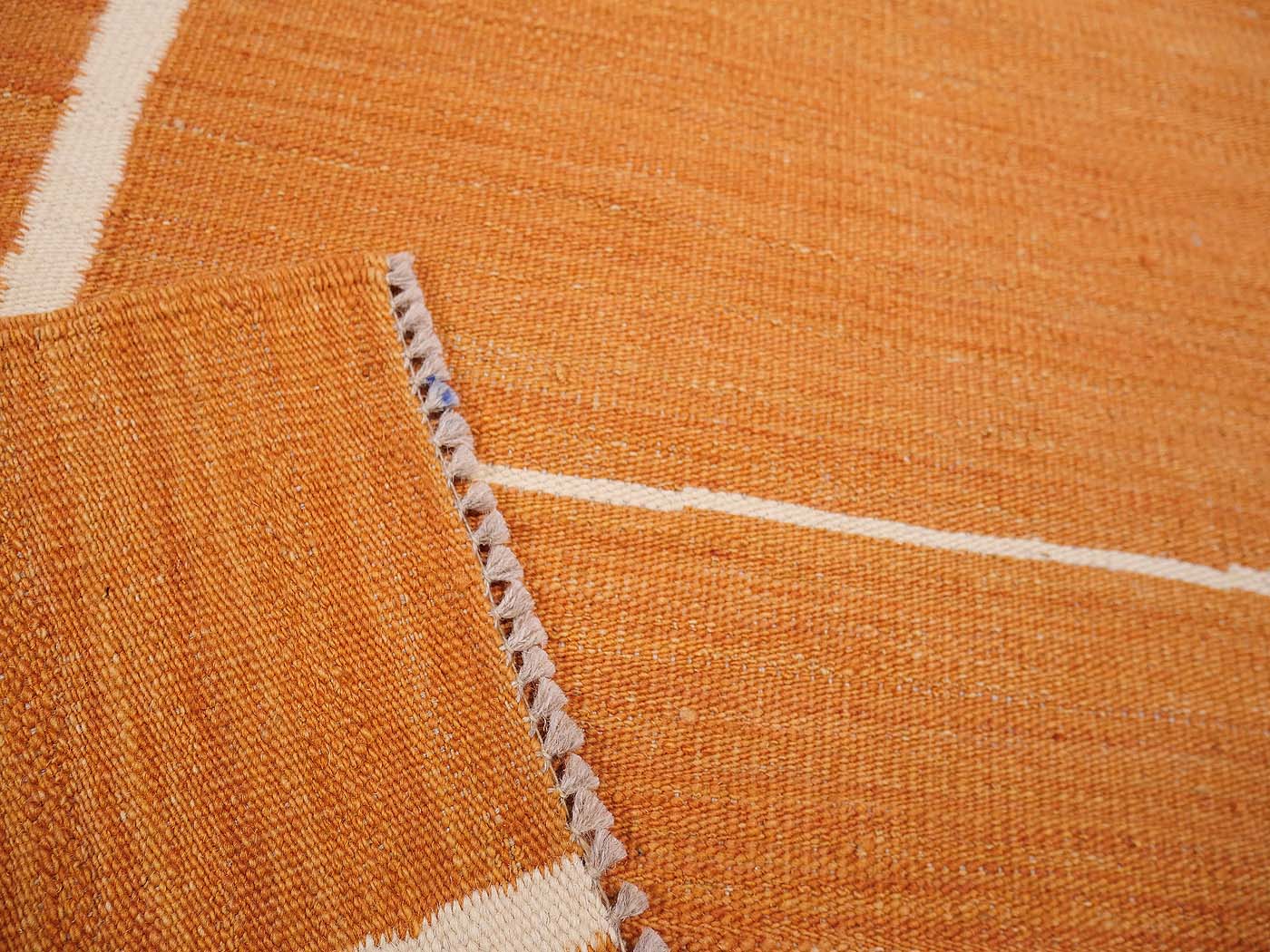 Ce tapis kilim fait main est tissé à plat selon une technique de tissage de tapisserie. Il est fabriqué exclusivement pour Nomade Kilim avec beaucoup de soin et d'attention aux détails. Nos nouveaux kilims s'inspirent des kilims anciens de Mazandaran tissés dans le nord de l'Iran, qui étaient pratiquement inconnus du commerce des tapis jusqu'à récemment et qui sont appréciés pour leurs motifs primitifs uniques et leurs combinaisons de couleurs minimalistes d'une grande beauté.