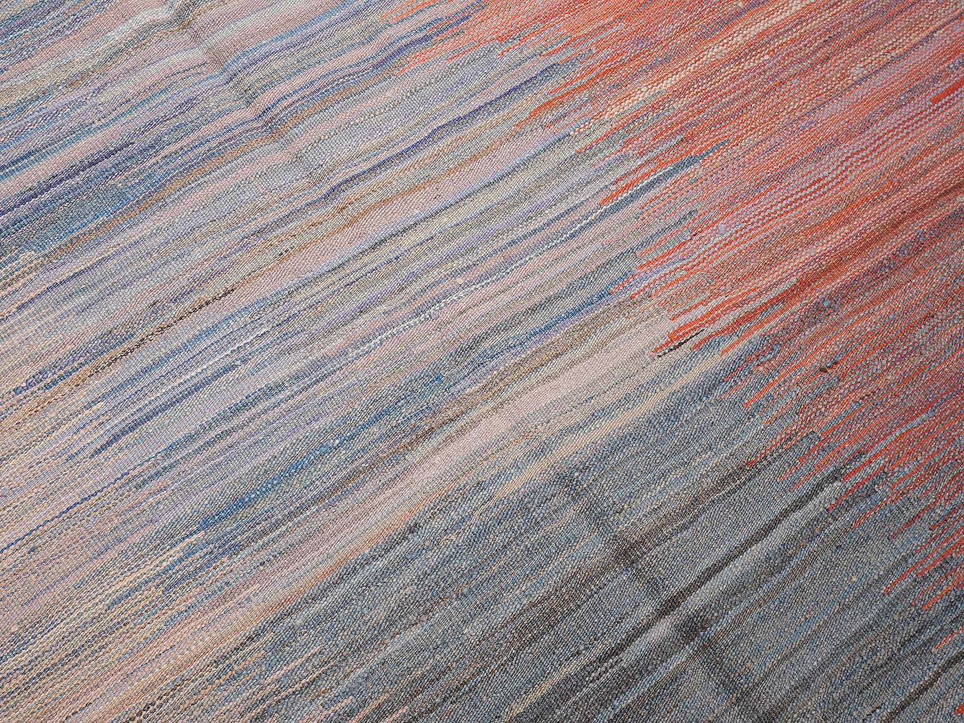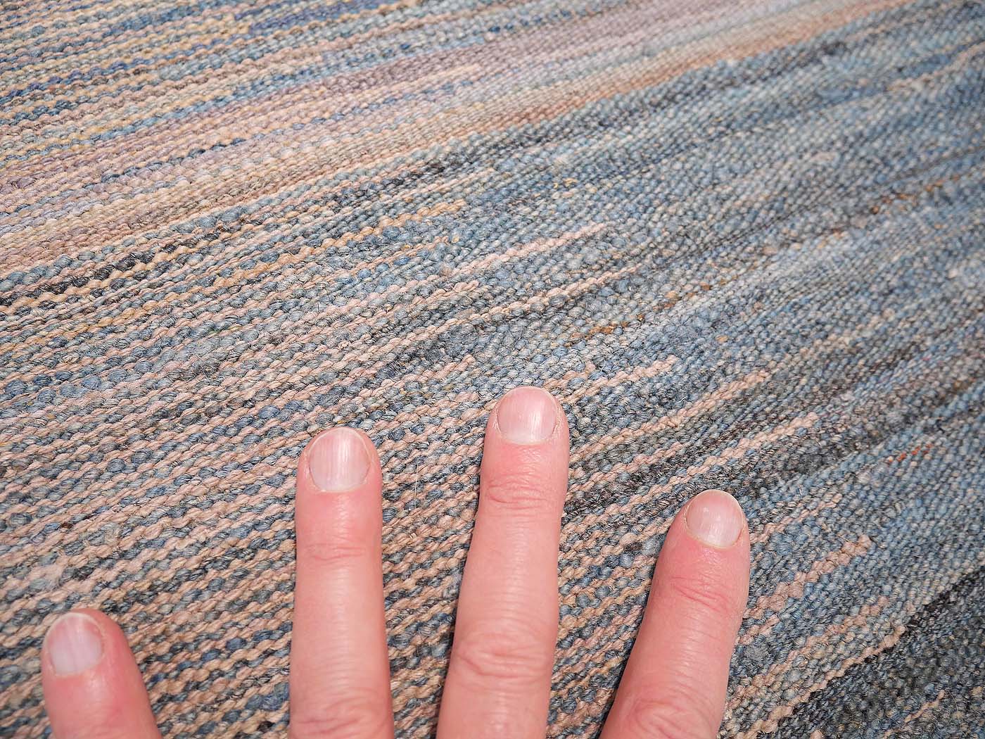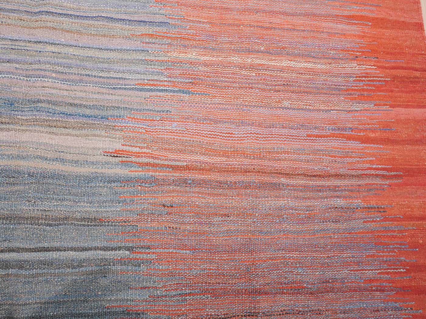 Ce tapis kilim fait main est tissé à plat selon une technique de tissage de tapisserie. Il est fabriqué exclusivement pour Nomade Kilim à partir de teintures naturelles et de laine filée à la main. Ces kilims ont une texture légèrement primitive et un riche abrash qui les fait ressembler aux kilims anciens prisés par les collectionneurs. Nous recherchons partout les motifs qui nous inspirent parmi un éventail éclectique de sources, notamment les tissages plats tribaux classiques, les textiles du monde entier et les abstractions modernes. Ces kilims comptent parmi les meilleurs tissés aujourd'hui.