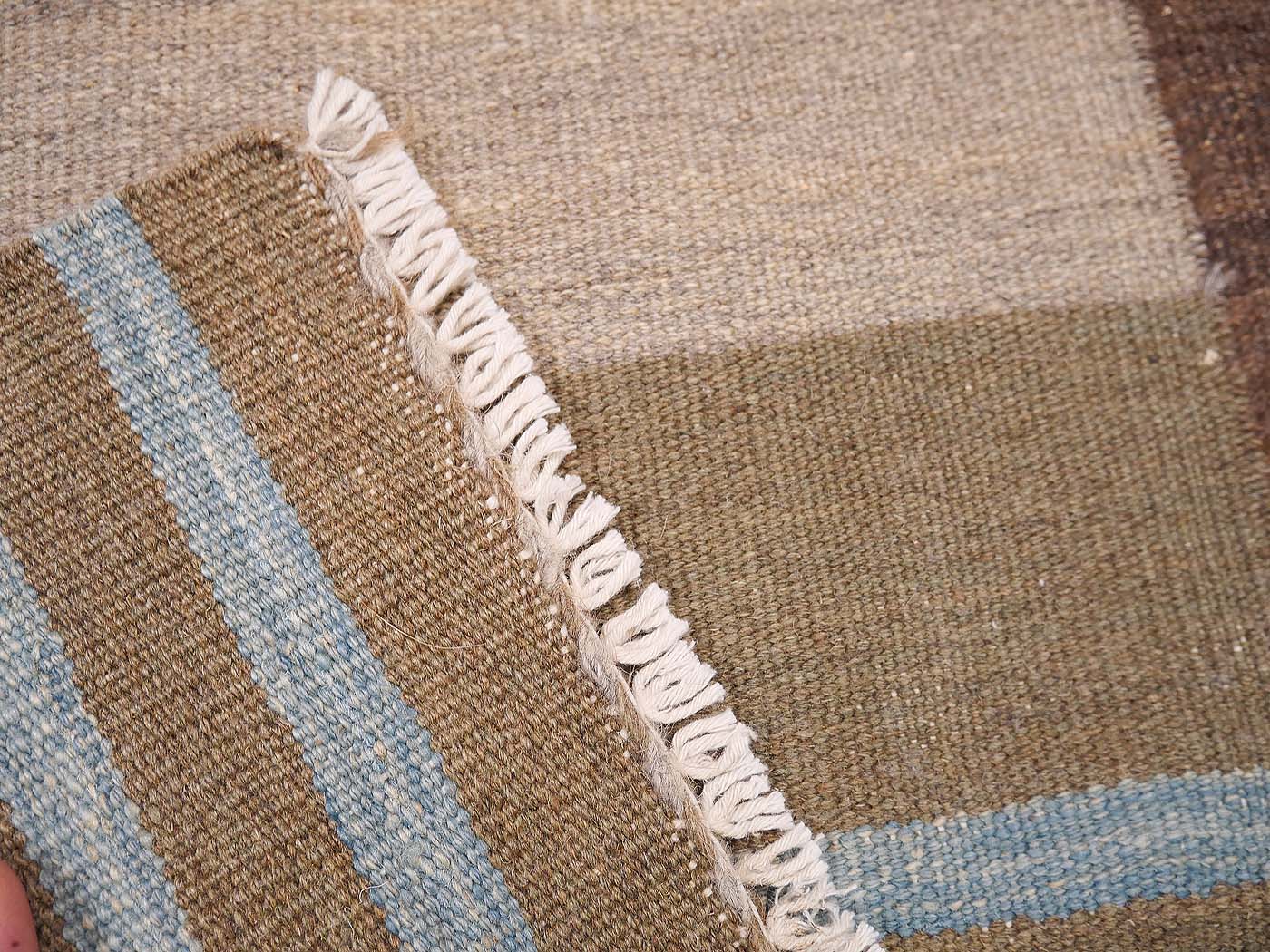 Ce tapis kilim fait main est tissé à plat selon une technique de tissage de tapisserie. Il est fabriqué exclusivement pour Nomade Kilim à partir de teintures naturelles et de laine filée à la main. Ces kilims ont une texture légèrement primitive et un riche abrash qui les fait ressembler aux kilims anciens prisés par les collectionneurs. Nous recherchons partout les motifs qui nous inspirent parmi un éventail éclectique de sources, notamment les tissages plats tribaux classiques, les textiles du monde entier et les abstractions modernes. Ces kilims comptent parmi les meilleurs tissés aujourd'hui.