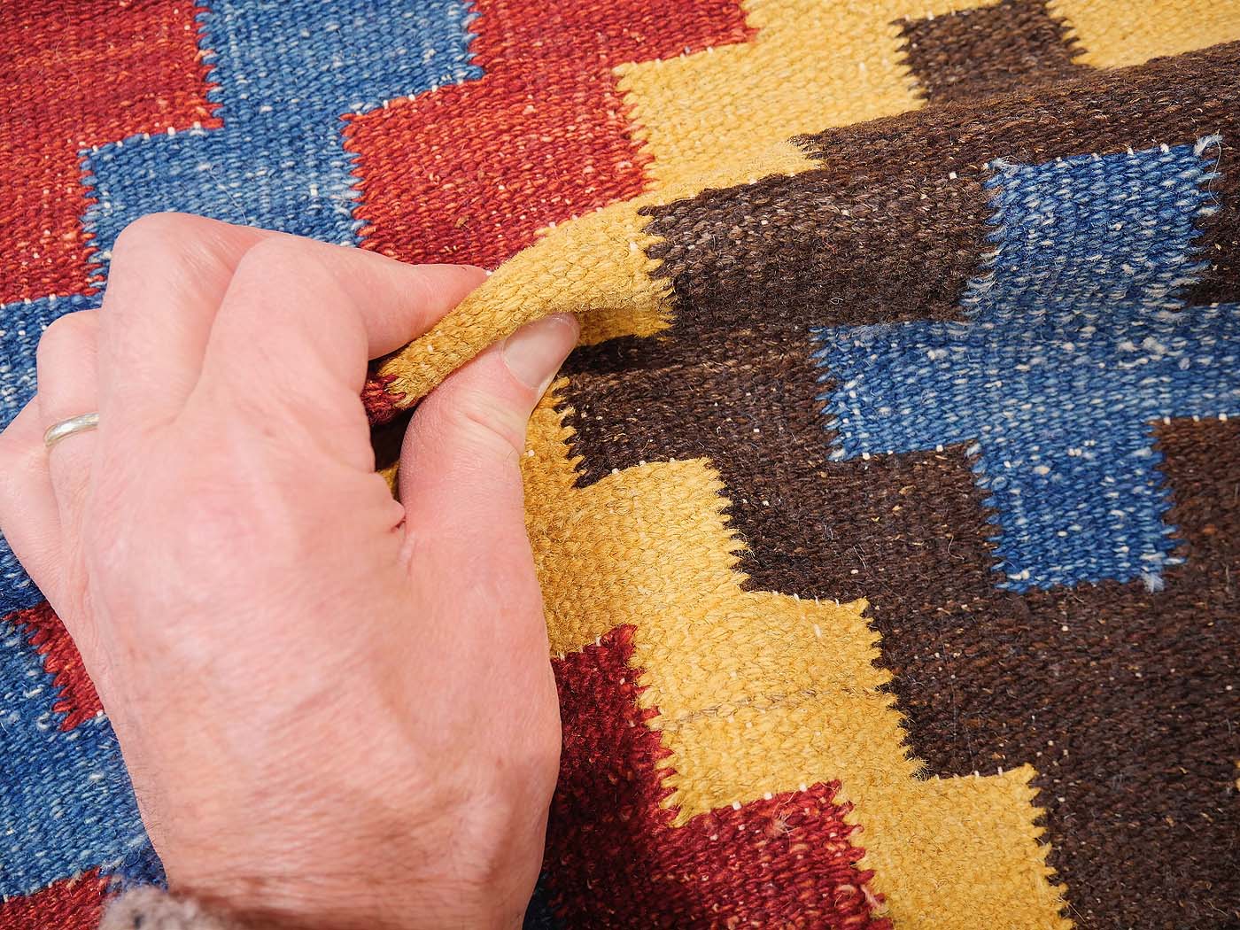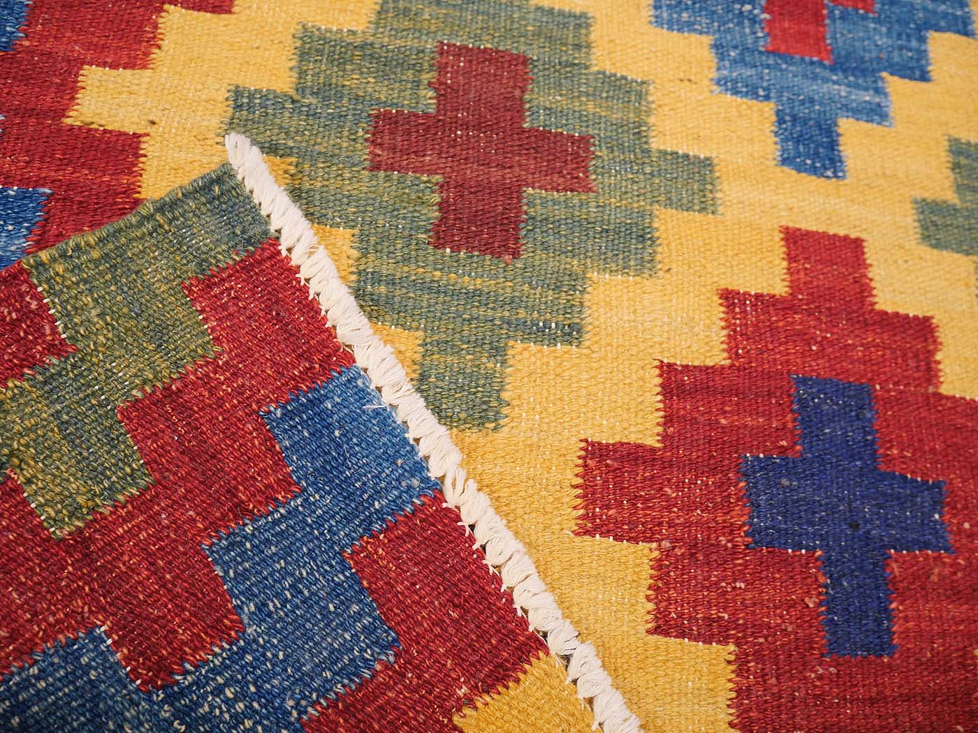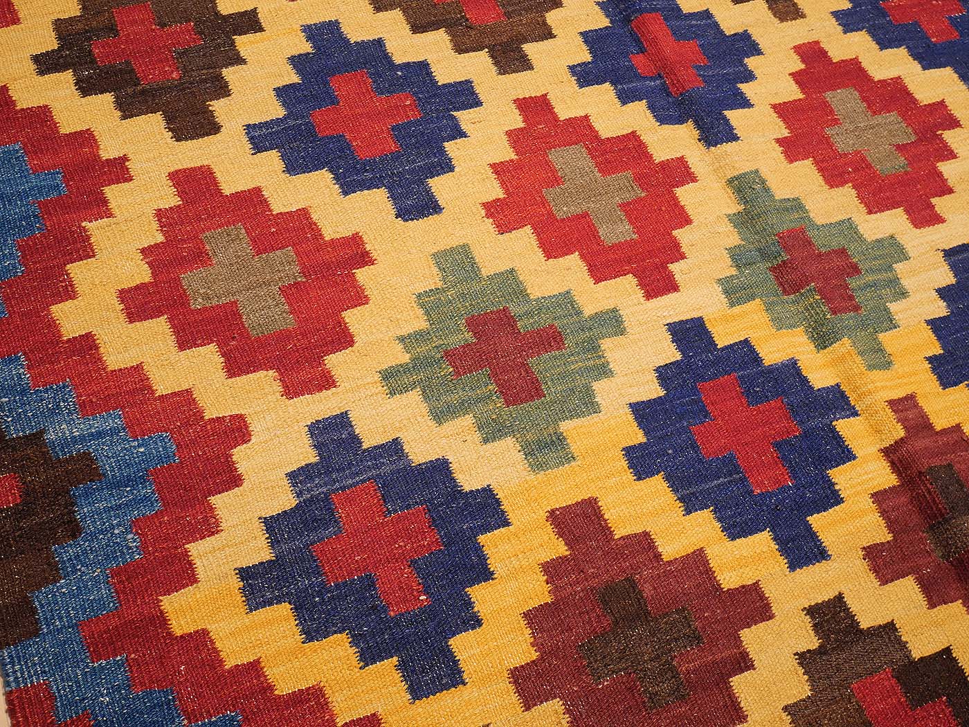 Ce tapis kilim fait main est tissé à plat selon une technique de tissage de tapisserie. Il est fabriqué exclusivement pour Nomade Kilim à partir de teintures naturelles et de laine filée à la main. Ces kilims ont une texture légèrement primitive et un riche abrash qui les fait ressembler aux kilims anciens prisés par les collectionneurs. Nous recherchons partout les motifs qui nous inspirent parmi un éventail éclectique de sources, notamment les tissages plats tribaux classiques, les textiles du monde entier et les abstractions modernes. Ces kilims comptent parmi les meilleurs tissés aujourd'hui.
