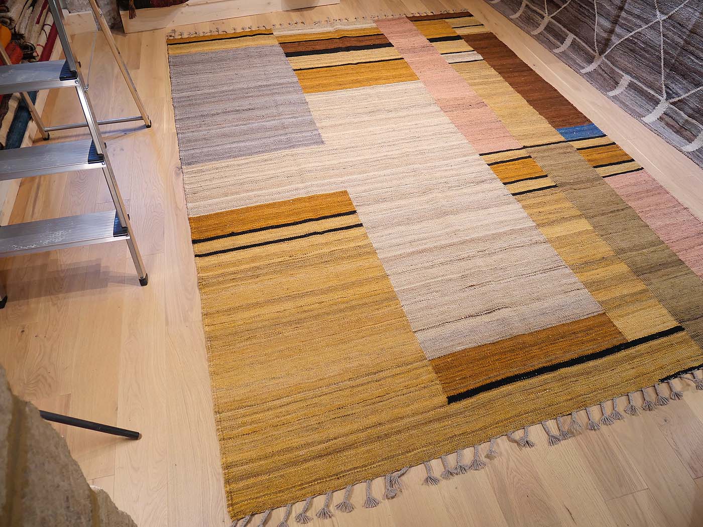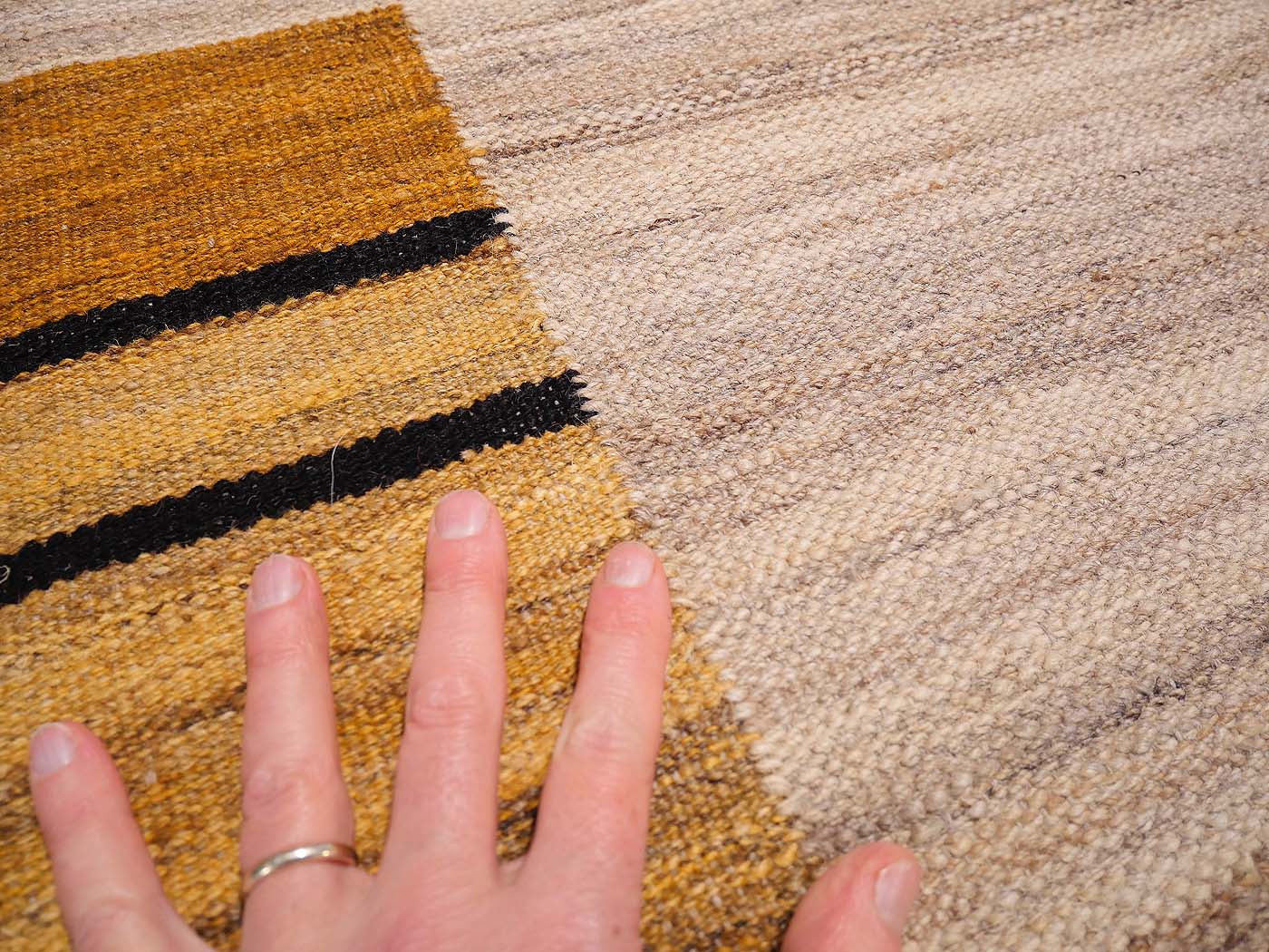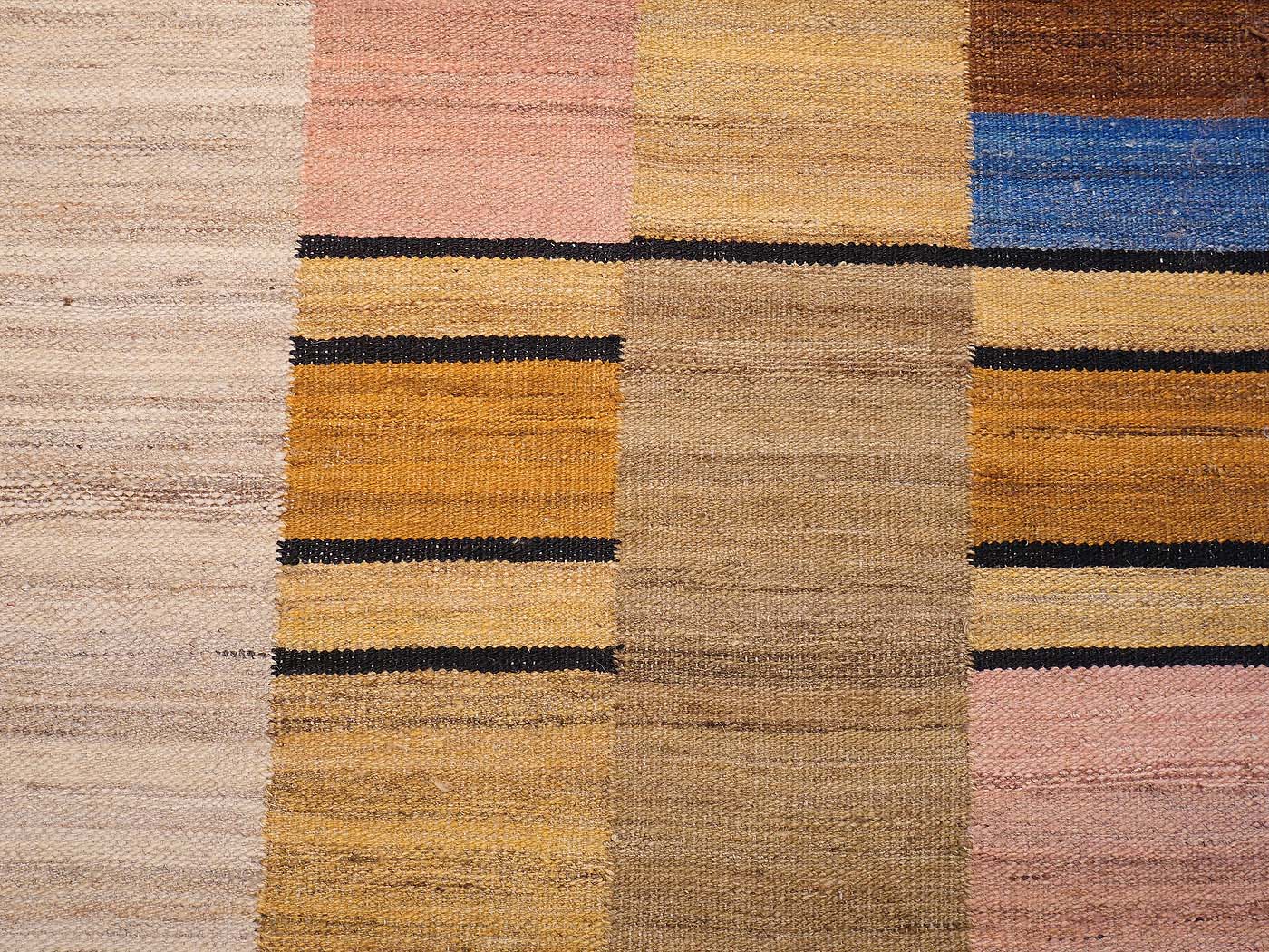 Ce tapis kilim fait main est tissé à plat selon une technique de tissage tapisserie très texturée. Fabriqué exclusivement pour Nomad Rugs en laine filée à la main. Il s'inspire des motifs textiles du milieu du siècle dernier, à l'époque du Bauhaus. Ces kilims ont une texture légèrement primitive et un riche abrash qui leur confère un aspect à la fois moderne et ancien. Ce sont parmi les plus beaux tapis kilim tissés à la main fabriqués aujourd'hui.