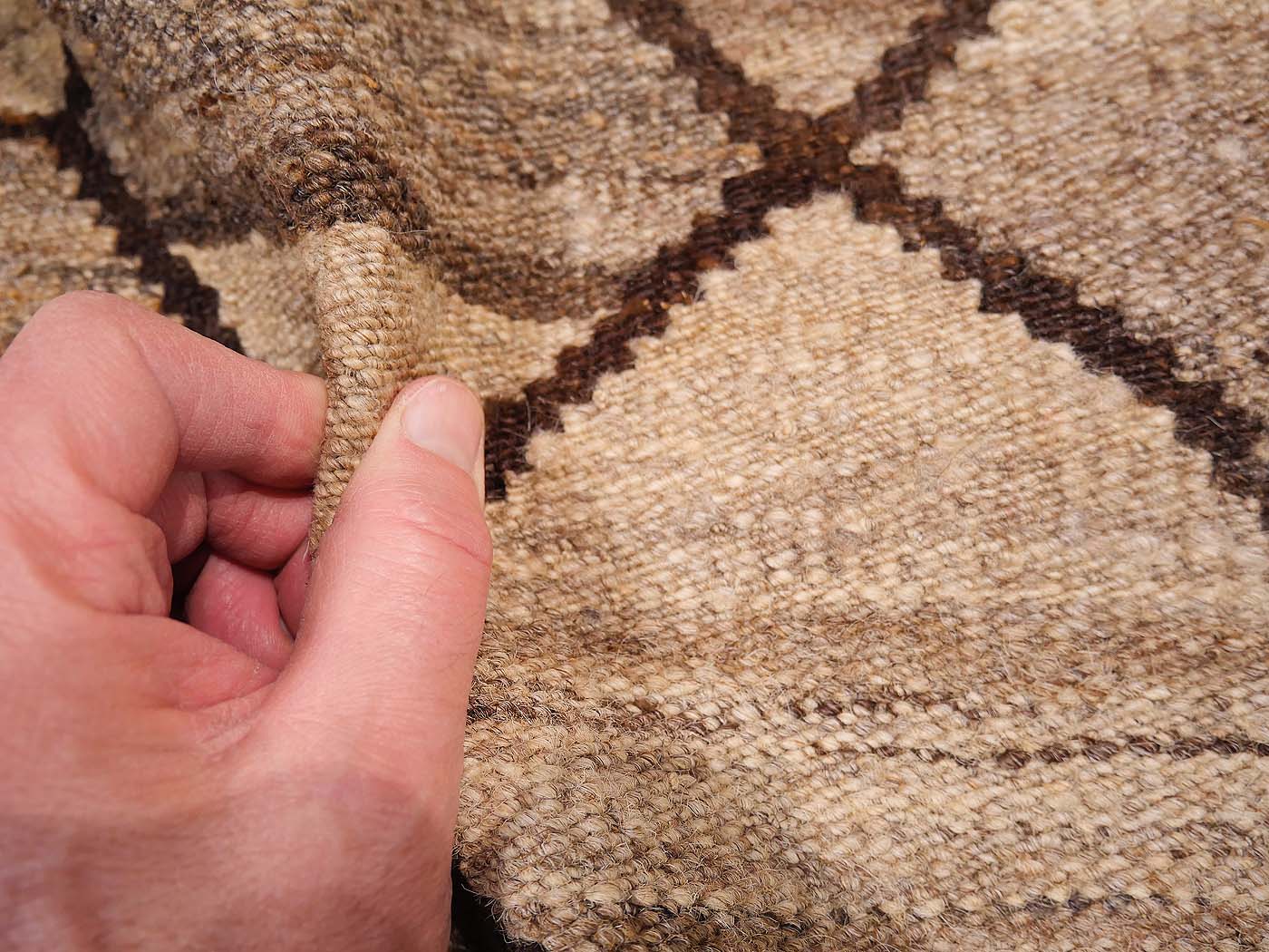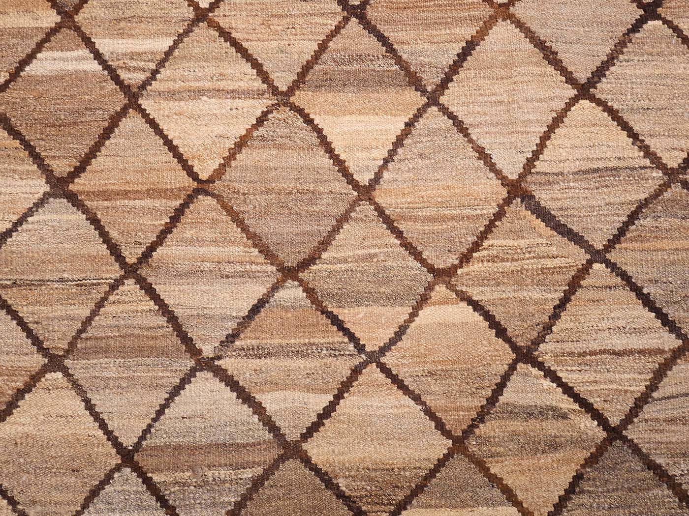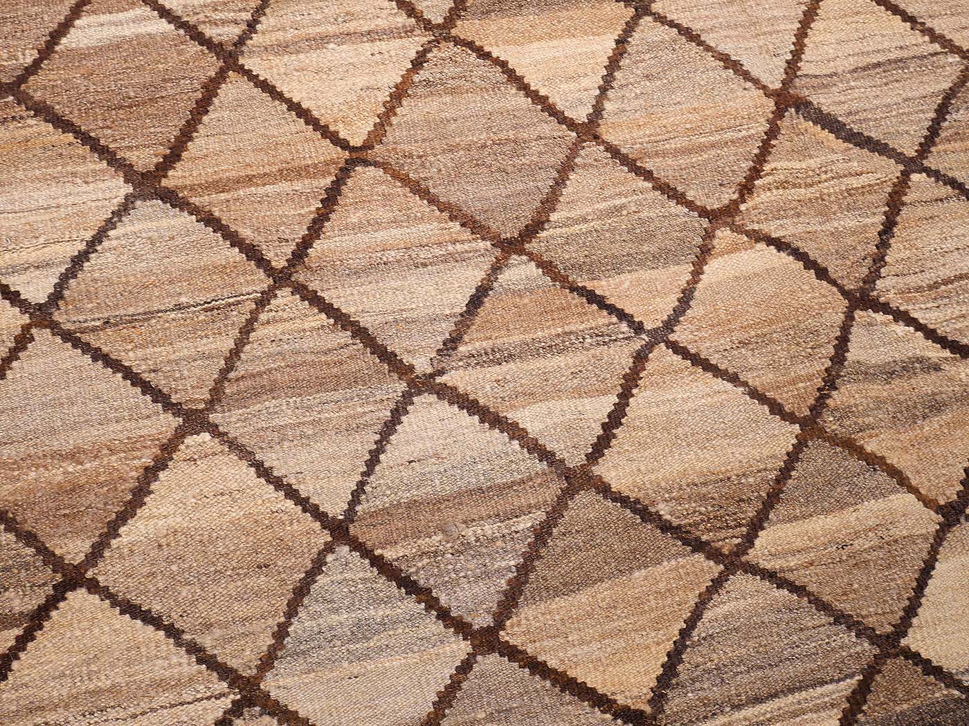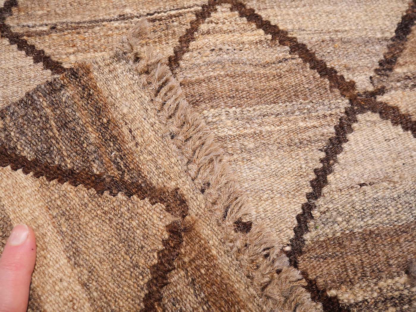 Ce tapis kilim fait main est tissé à plat selon une technique de tissage de tapisserie et fabriqué à partir de laine naturelle non teinte filée à la main. Ces kilims présentent un design primitif moderne avec une texture magnifique et des éléments tribaux. Un tissage tribal revisité avec une sophistication moderne. Entièrement fait main avec de la magnifique laine Ghazni.