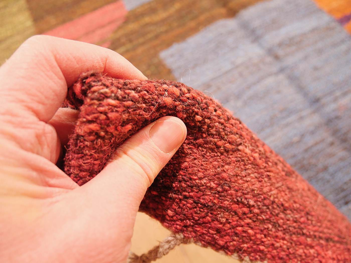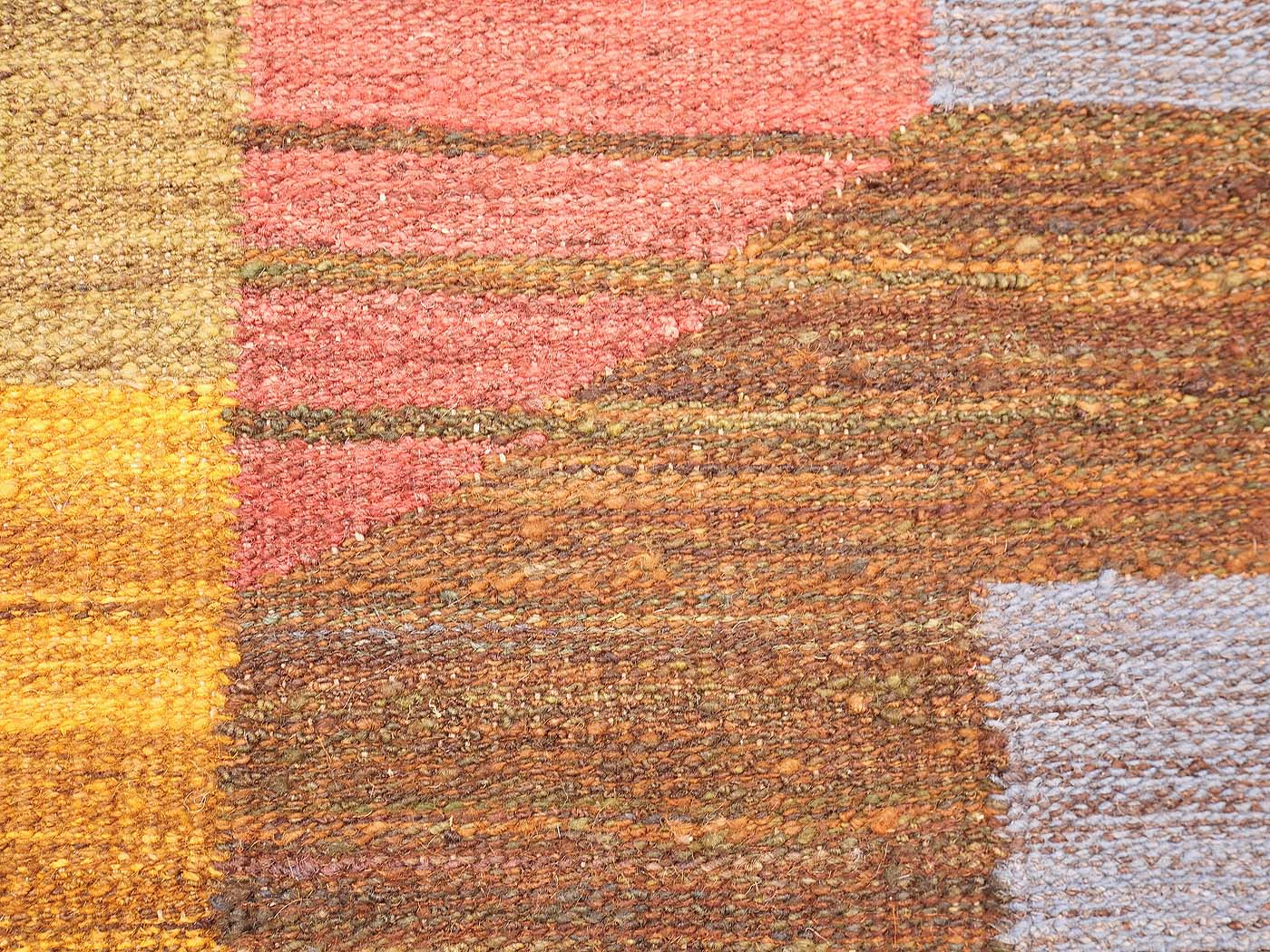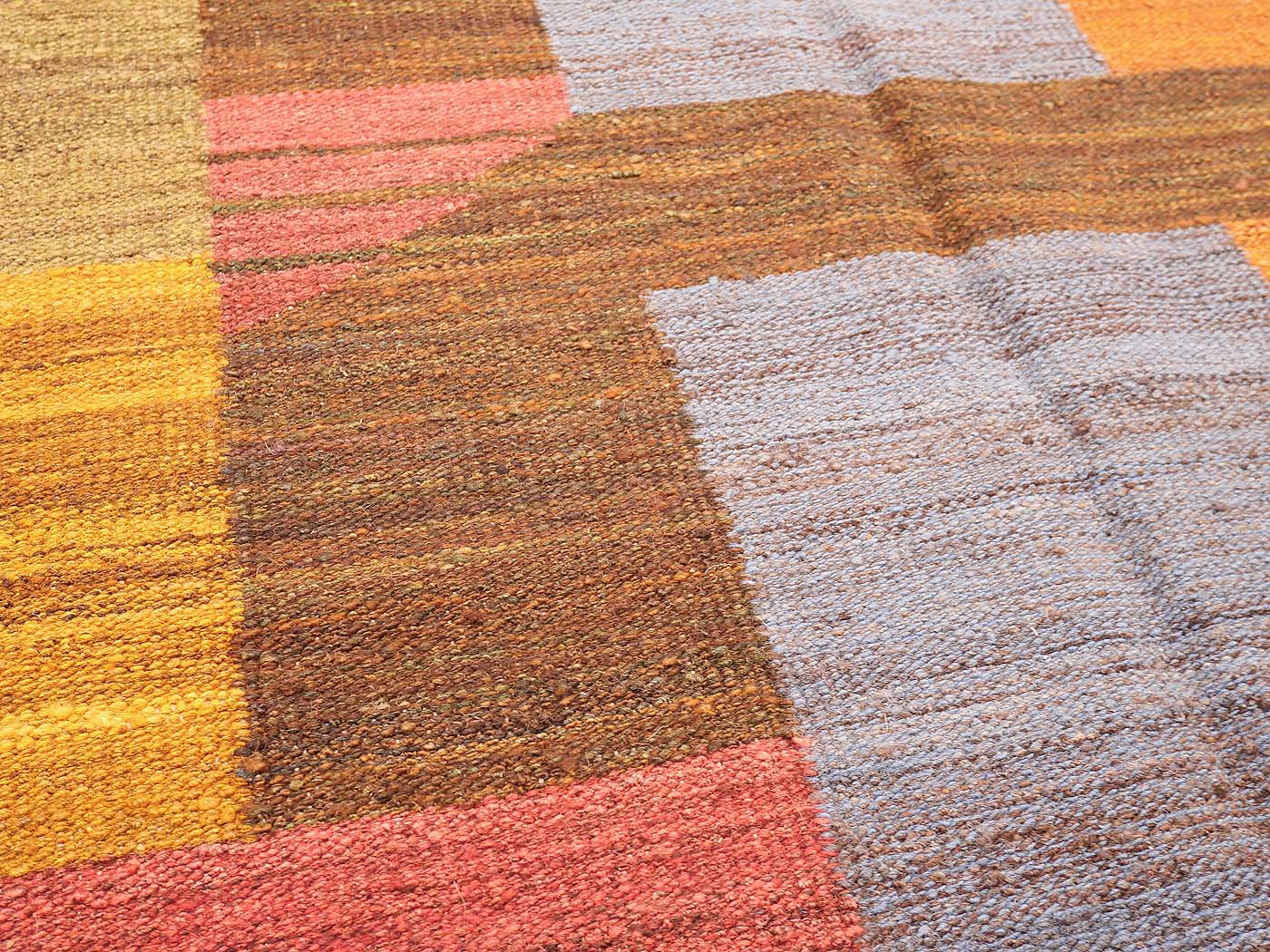 Ce tapis kilim fait main est tissé à plat selon une technique de tissage tapisserie très texturée. Fabriqué exclusivement pour Nomad Rugs en laine filée à la main. Il s'inspire des motifs textiles du milieu du siècle dernier, à l'époque du Bauhaus. Ces kilims ont une texture légèrement primitive et un riche abrash qui leur confère un aspect à la fois moderne et ancien. Ce sont parmi les plus beaux tapis kilim tissés à la main fabriqués aujourd'hui.