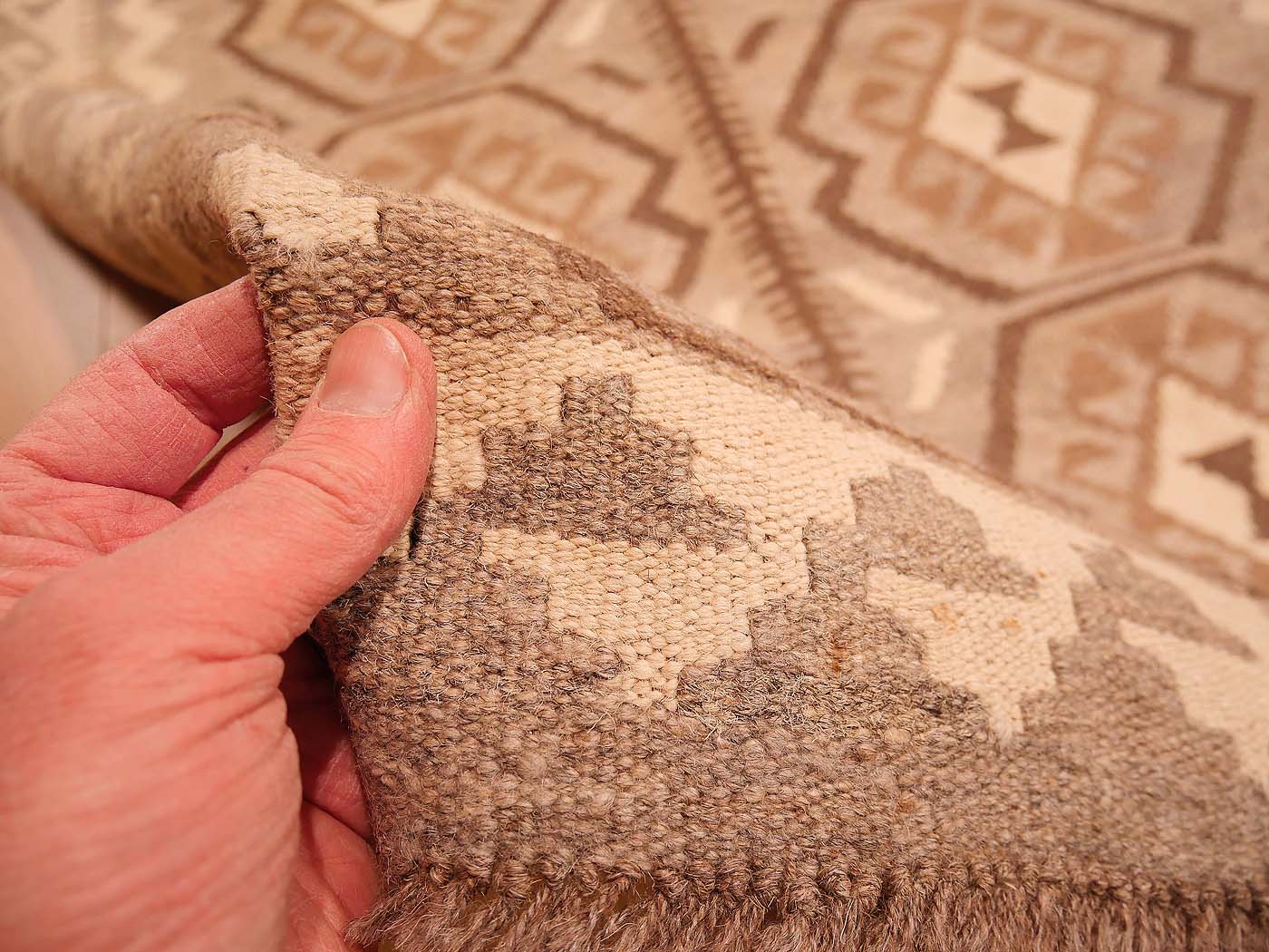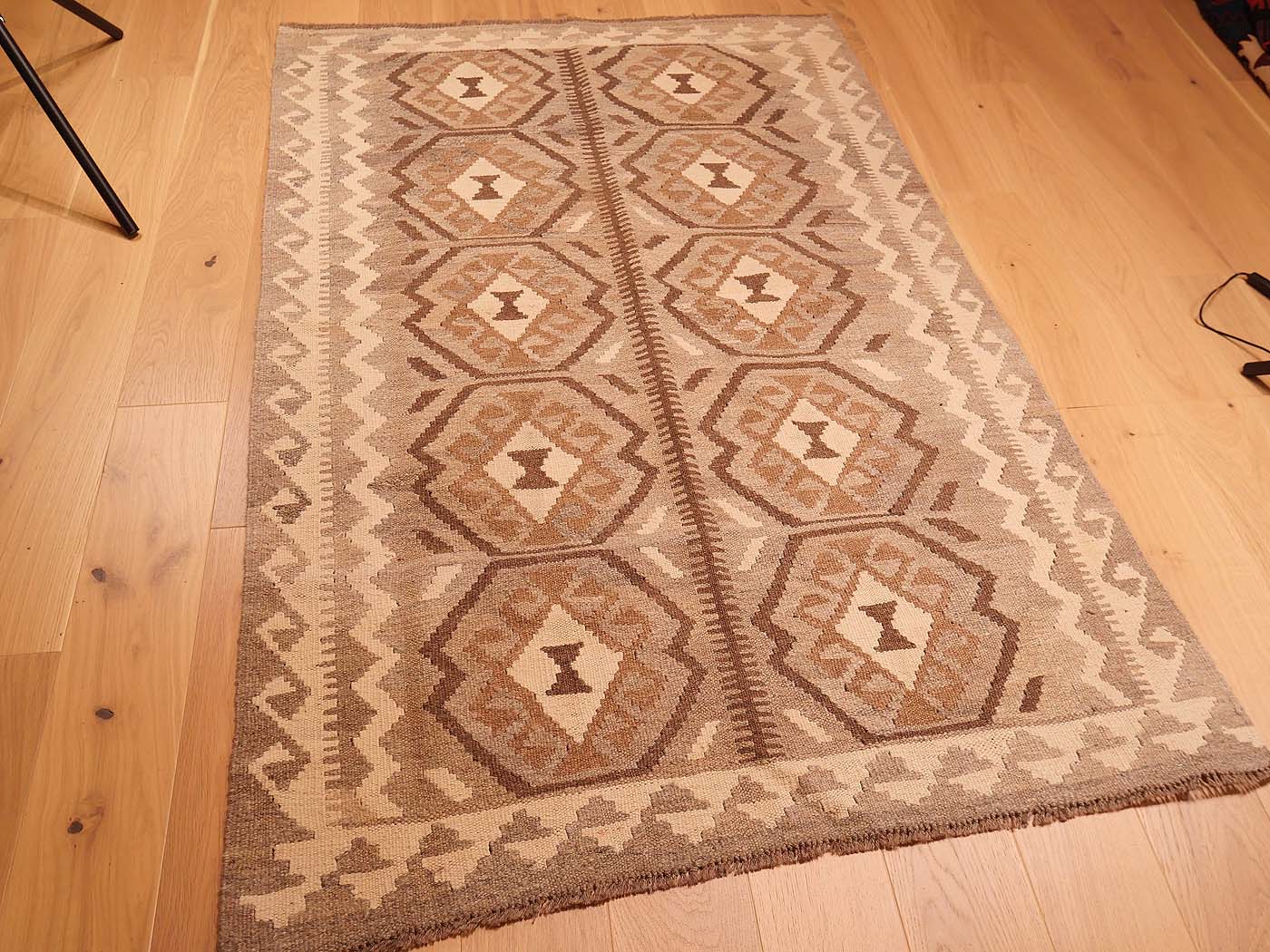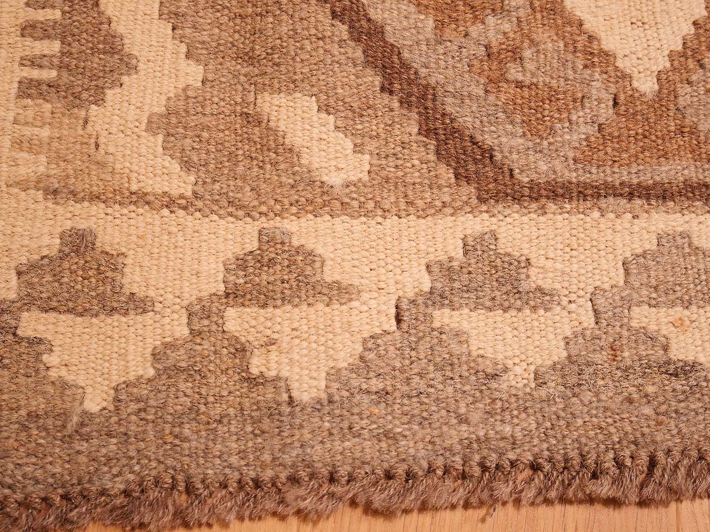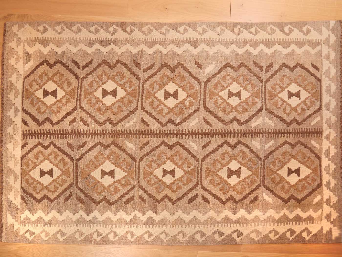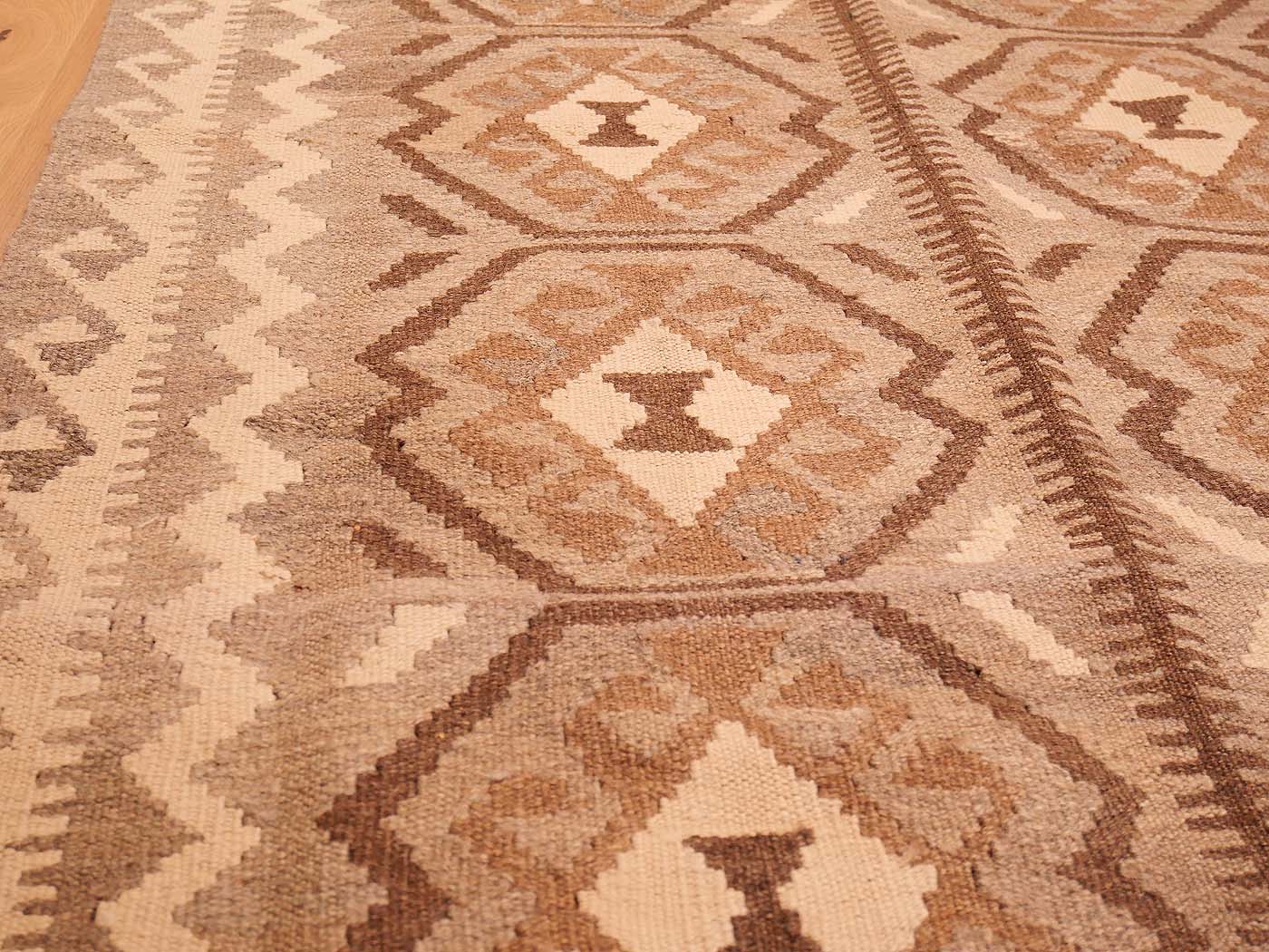 Ce tapis kilim fait main est tissé à plat selon une technique de tapisserie et entièrement fabriqué à partir de laine afghane naturelle non teinte et filée à la main. Ces tapis d'une élégance exceptionnelle tirent leur couleur uniquement des variations naturelles de la laine non teinte. Ils sont tissés par des tisserands ouzbeks dans le centre de l'Afghanistan, près de la ville de Maimana. Les motifs archaïques ont peu changé au fil des siècles. Ce kilim Maimana revisité présente une texture magnifique et des tons neutres élégants ; il est raffiné, sobre et subtil. C'est un magnifique kilim tribal pour les intérieurs modernes.