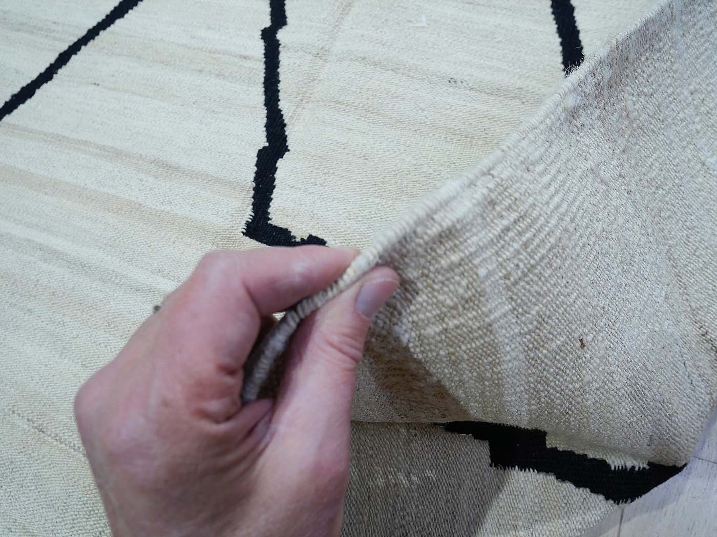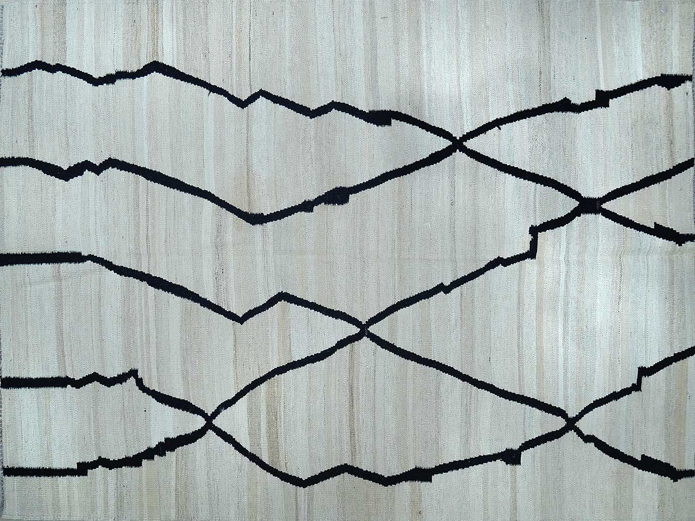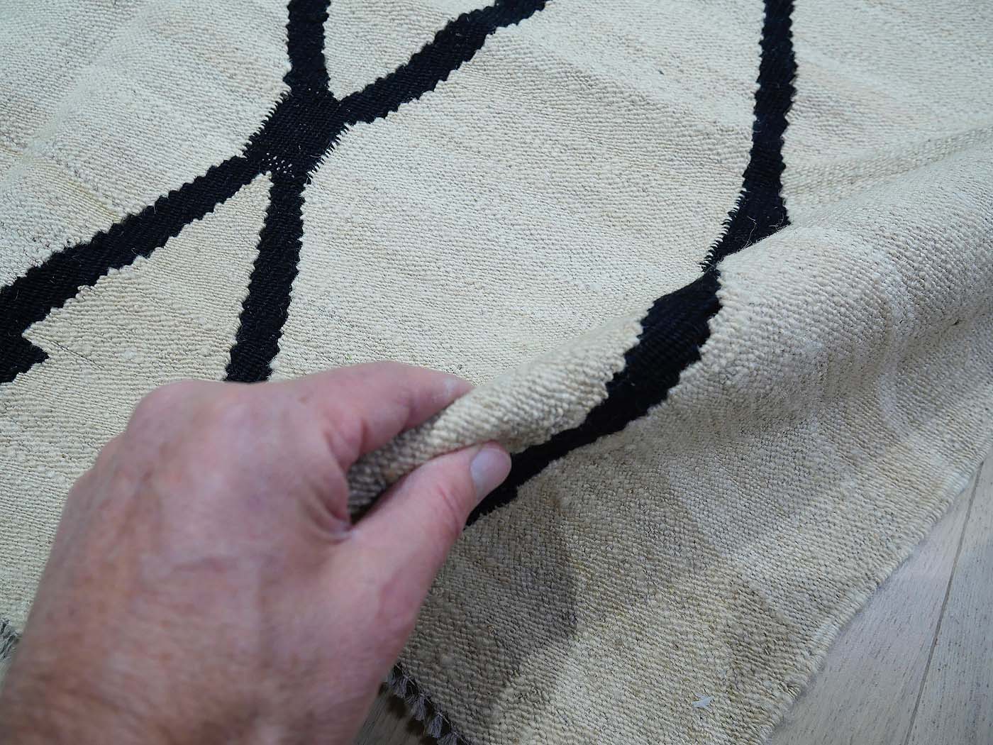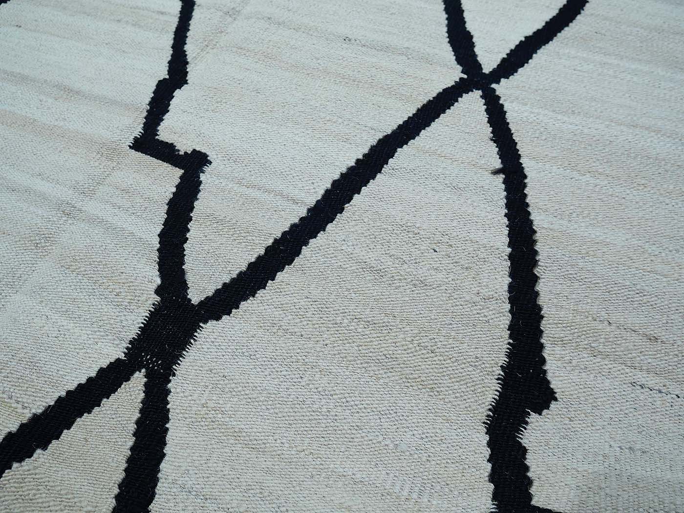 Ce tapis kilim fait main est tissé à plat selon une technique de tissage de tapisserie. Il est fabriqué exclusivement pour Nomade Kilim avec beaucoup de soin et d'attention aux détails. Nos nouveaux kilims s'inspirent des kilims anciens de Mazandaran tissés dans le nord de l'Iran, qui étaient pratiquement inconnus du commerce des tapis jusqu'à récemment et qui sont appréciés pour leurs motifs primitifs uniques et leurs combinaisons de couleurs minimalistes d'une grande beauté.